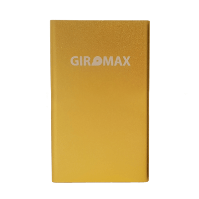 Плоский аккумулятор в алюминиевом корпусе золотистого цвета. Прибор оснащен индикатором уровня заряда и универсальным портом